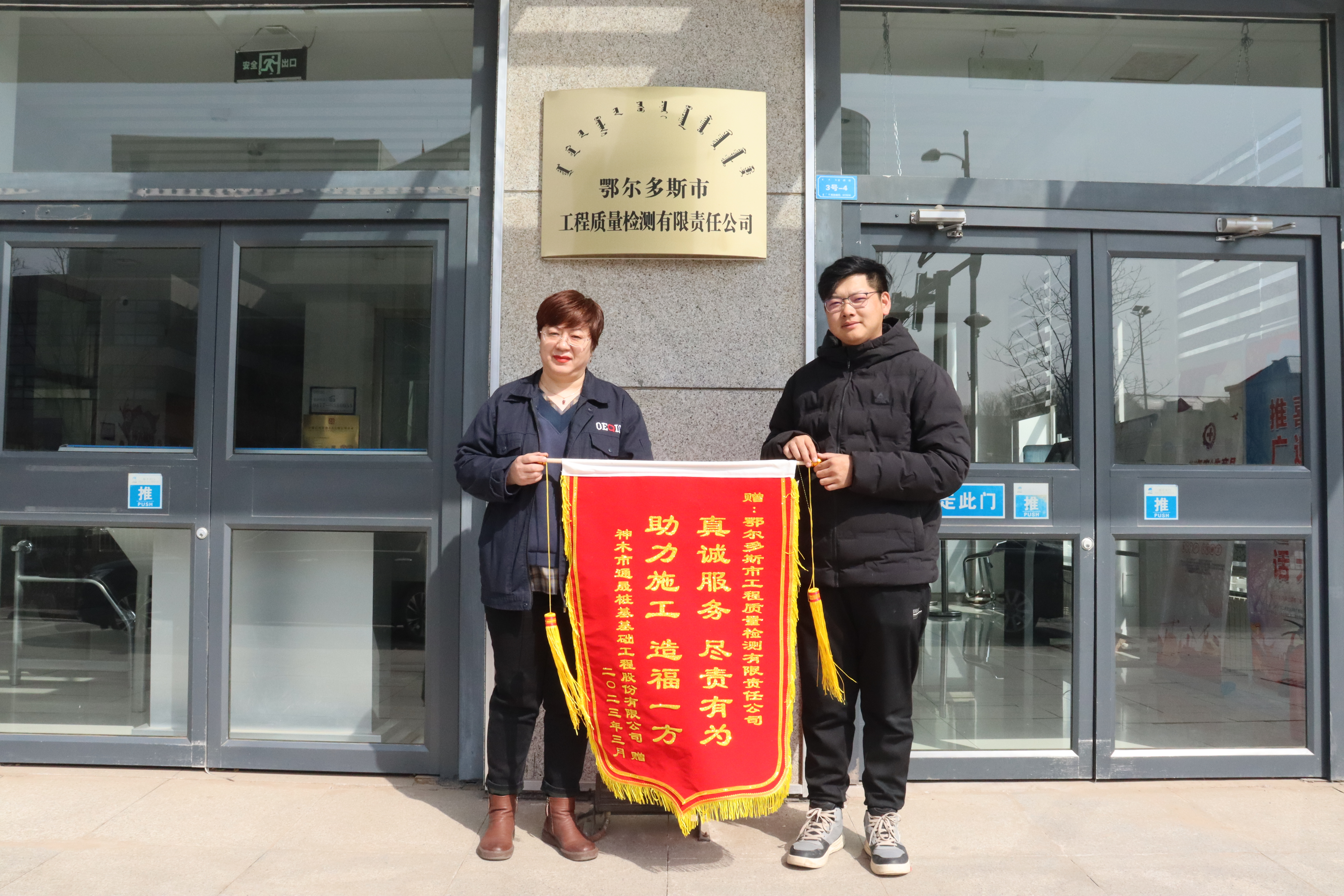 近日,神木市通晟桩基基础工程股份有限公司职工代表将一面印有“真诚服务、尽责有为、助力施工、造福一方”的锦旗送到市工程质量检测公司,对公司在乌兰鑫瑞煤化工有限责任公司30万吨/年煤焦油加氢项目地基基础检测过程中提供优质、高效服务表示诚挚感谢。