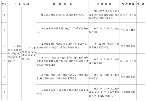 (三)重点推进优化营商环境信息公开。全面准确贯彻全区优化营商环境大会精神,细化服务监管信息公开。围绕推动“四办”工作(“蒙速办·一网办”“蒙速办·掌上办”“蒙速办·一次办”“蒙速办·帮您办”),进一步提高政务服务透明度和便利度,依托“12345”热线、政务服务场所和政府网站,为企业和群众提供“一站式”的信息公开服务。以推动市场监管规则和标准更加公开透明为重点,在2021年底前将本地区本部门现行有效的规章和规范性文件通过政府门户网站政府信息公开专栏进行集中公开。加强对简政放权、减税降费及信用信息的公开力度,更加全面、清晰、准确传达自治区党委、政府优化营商环境的政策信号,提振市场信心。