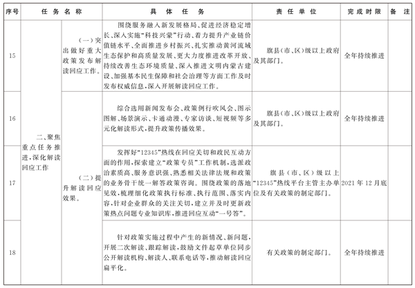 (一)突出做好重大政策发布解读回应工作。认真贯彻落实全区经济工作会议精神和《政府工作报告》要求,按照习近平总书记和党中央对内蒙古的战略定位,围绕服务融入新发展格局、促进经济稳定增长、深入实施“科技兴蒙”行动、着力提升产业链价值链水平、全面推进乡村振兴、扎实推动黄河流域生态保护和高质量发展、更大力度推进改革开放、持续改善生态环境质量、深入推进文明内蒙古建设、加强基本民生保障和社会治理等方面工作,及时发布权威信息,深入开展解读回应工作,有效引导社会预期。更加注重对政策背景、出台目的、重要举措等方面的解读,对政策制订过程中收集到的普遍关注点和疑惑点,要有针对性地予以解答回应。